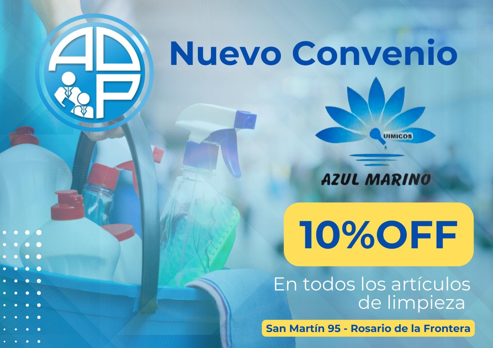Nuevo Convenio para nuestros afiliados. AZUL MARINO (Rosario de la Frontera). A partir de hoy los afiliados podrán acceder a un 10 % de descuento en todos los artículos de limpieza abonando en efectivo o transferencia bancaria. Deben presentar documento y último recibo de sueldo.