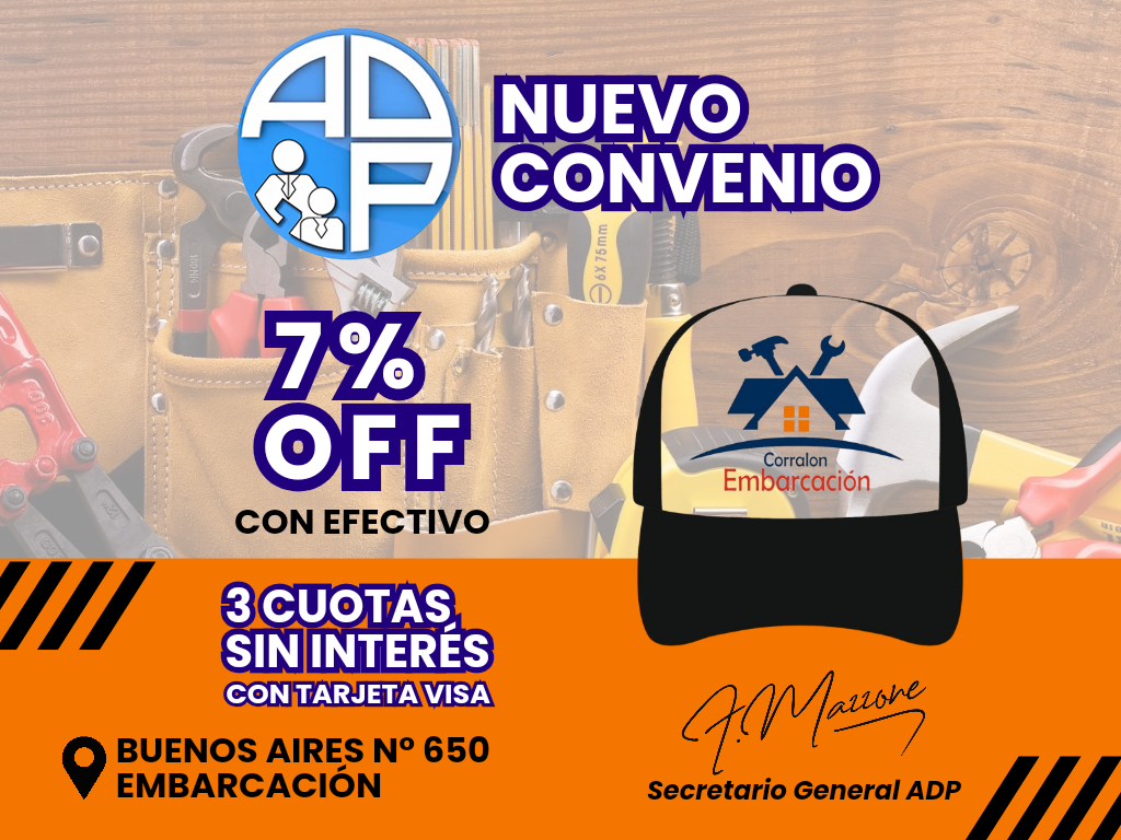 Nuevo convenio con "Corralon Embarcación". A partir de hoy nuestros afiliados podrán acceder a un 7 % de descuento pagando con efectivo ó hasta en 3 cuotas sin interés pagando con tarjeta visa. Deben presentar documento y último recibo de sueldo.